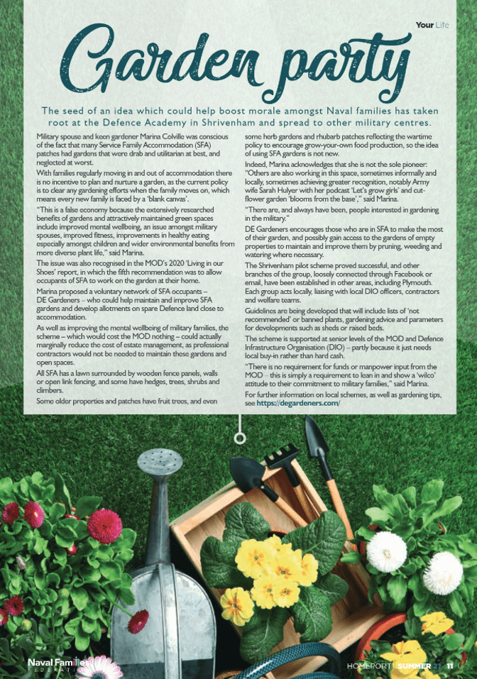 I’m delighted to have been written up in Homeport, The Naval Families Federation’s Magazine for RN & RM Families. Let’s get gardening!