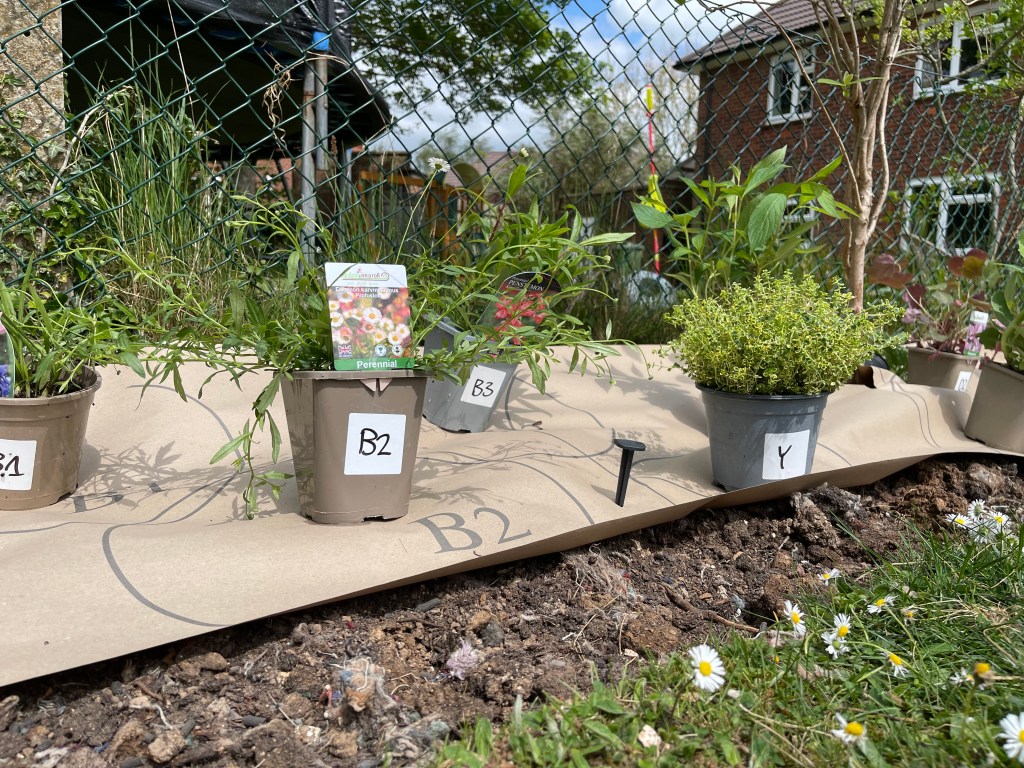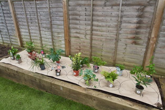 Having recovered from the sheer joy and overwhelming excitement of your order landing on your doorstep, you roll out the bio-degradable planting template onto your prepared area. The box contains pegs to hold the template in place so with or without the help of dogs, children and the weather you can plough on. You then match the lettered plant to the marked spot on the paper, make a hole (X marks the spot) and pop the plant in. Feed, cover the whole thing in a layer of compost, water and stand back to admire.