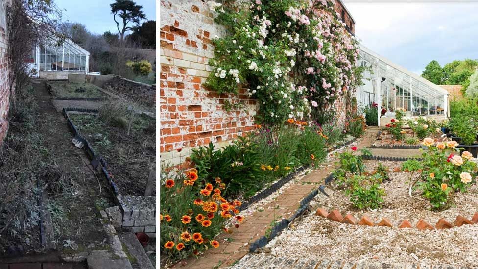 However, the garden was not maintained and fell into ruin so it was a wilderness when in 2019 Capt Vicki Gosling co-ordinated a team of volunteers around a plan to restore the garden into a usable space for the current community. Plants were propagated and sold to raise funds to buy tools and as the garden was uncovered, so was the enthusiasm of more and more volunteers under the auspices of head gardener Annie Bamber. The garden now houses new allotments and restored vegetable beds. A Black Hamburg vine was discovered, growing since the 1800s it has been restored by volunteer Katie Greenwood and although it was hoped the garden would produce it’s own Walled Garden Muscat wine to help raise funds for future maintenance, it was found to produce table grapes as opposed to wine producing grapes.